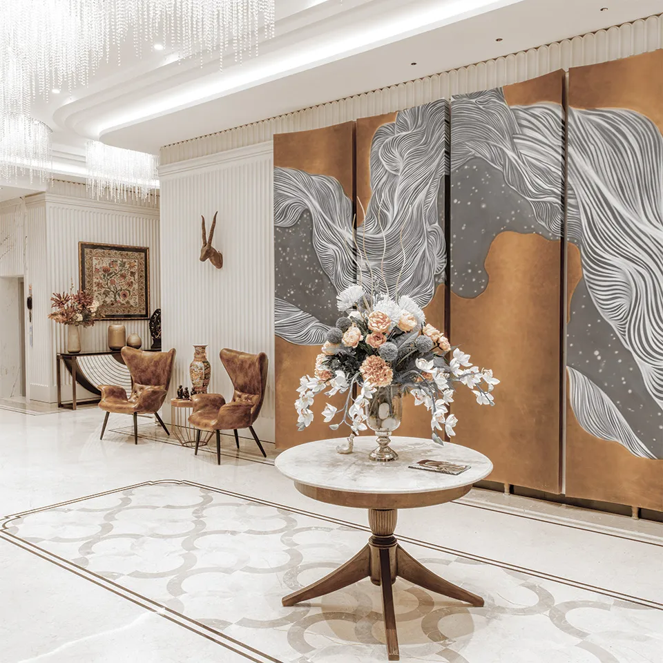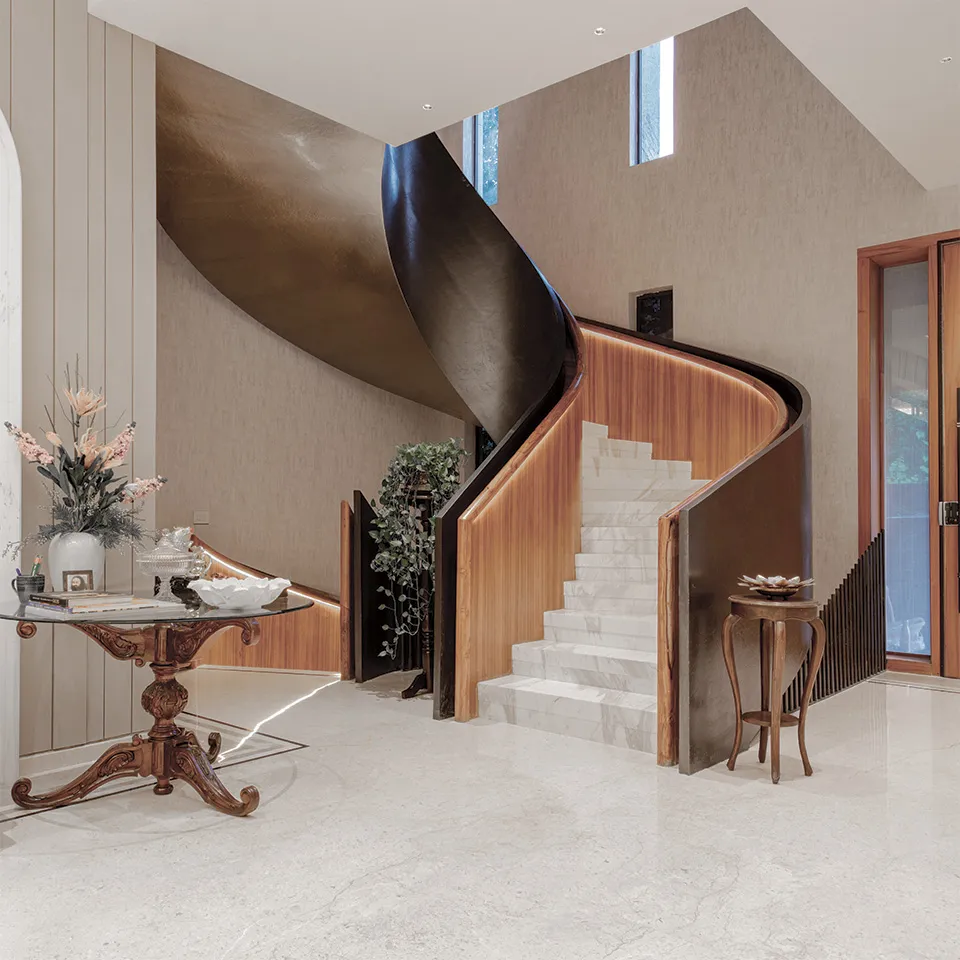 This exclusive residence offers a perfect blend of luxury and creativity, difficult to describe in individual details but easy to grasp in its overall intent. Everything is harmonious and orderly, carefully chosen and arranged within the space and in close relationship with the surrounding elements. The focus is on “fullness” rather than emptiness, yet it is a refined abundance in which to immerse and identify, expressing a personal and well-defined style. To narrate the space, we can choose two key elements, capable of characterizing the space from every angle, highlighting the expressive and artistic potential of the project. Both are united by a reflection on heights, making the spaces even more spacious and grandiose.
