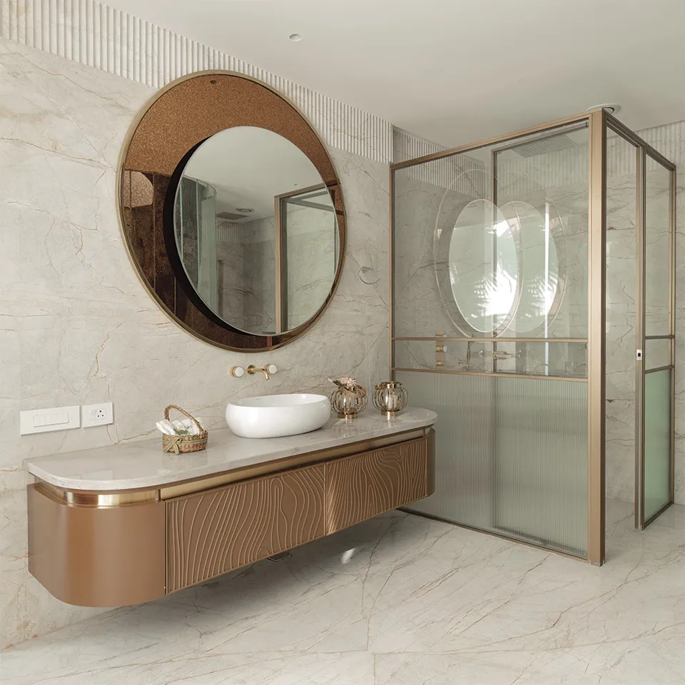 For the sink areas, the collection that best highlights the luxurious and multifaceted nature of the project is TEXTURE COLLECTION , a modern classic designed by Meneghello & Paolelli Associati. Texture changes finish in each space, but allows for further customization by changing the control cover, which can be white marble on a gold base in a light-colored space, or a total black chrome look to highlight dark details, and so on.